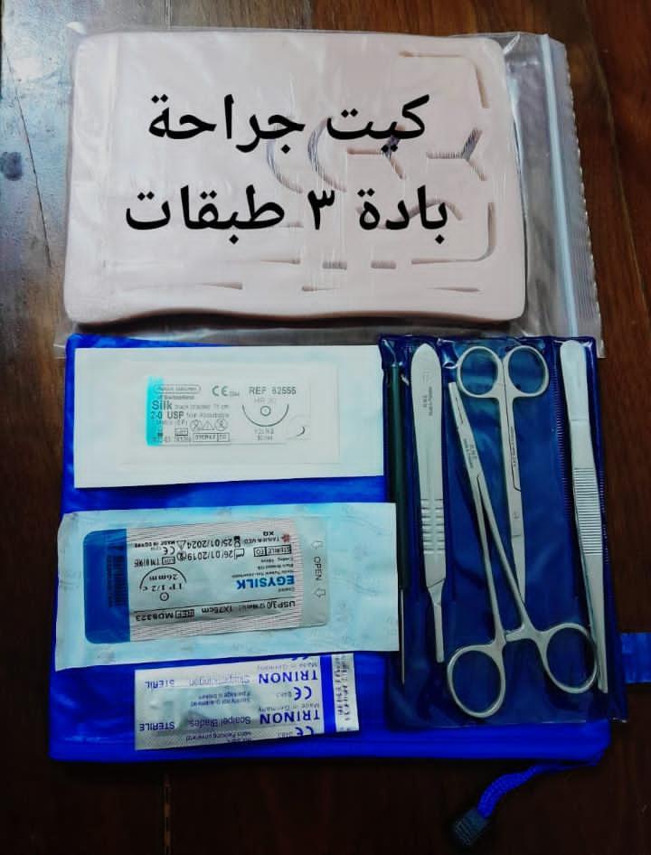 كيت التدريب الجراحي العملي مع بادة ذو 3 طبقات ويشمل: 1.بادة سيليكون 3 طبقات (جلد+أنسجة+عضلات) 2.ماسك ابر قوي 3.جفت ستاندرد 14.5سم 4.يد مشرط 13سم 5.مقص تشريح شارب 6.لانسيت لفك الخيط 7.مشرط معقم 8.مشرط وعبوتين خيوط وإبر